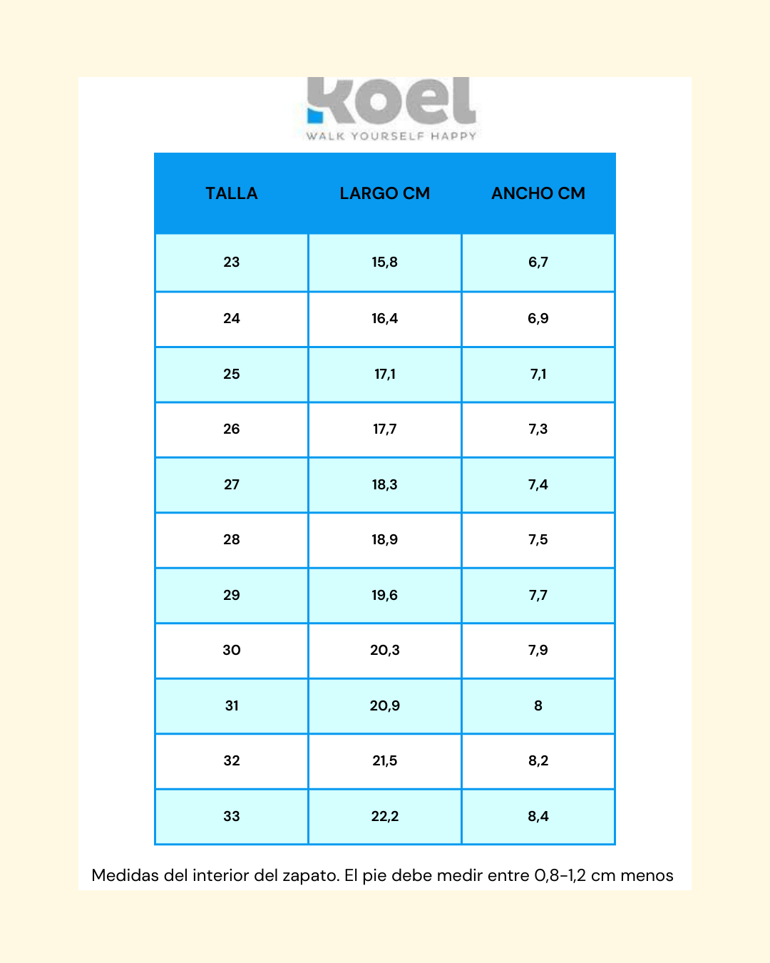 The measurements in the size chart refer to the shoe's internal capacity. The foot should be 0.8-1.2cm smaller.