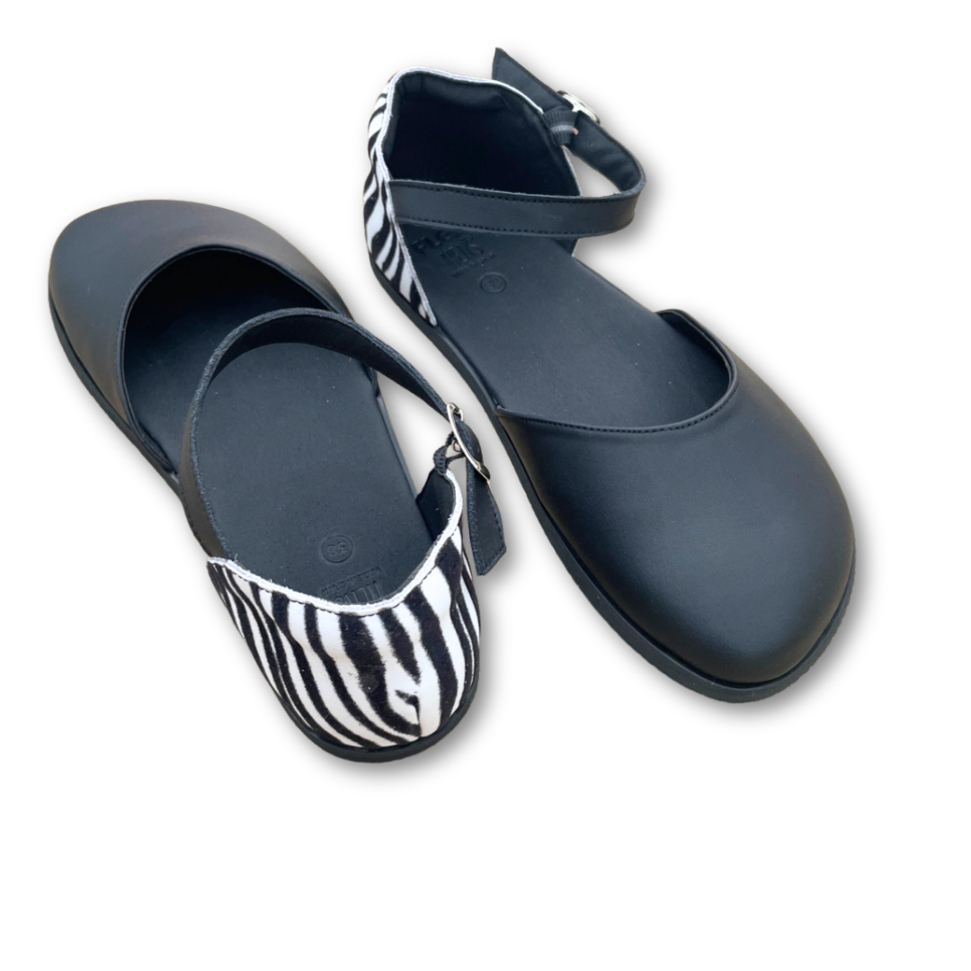 Zapato de salón barefoot FlexiNens en piel negra con talonera cebra
