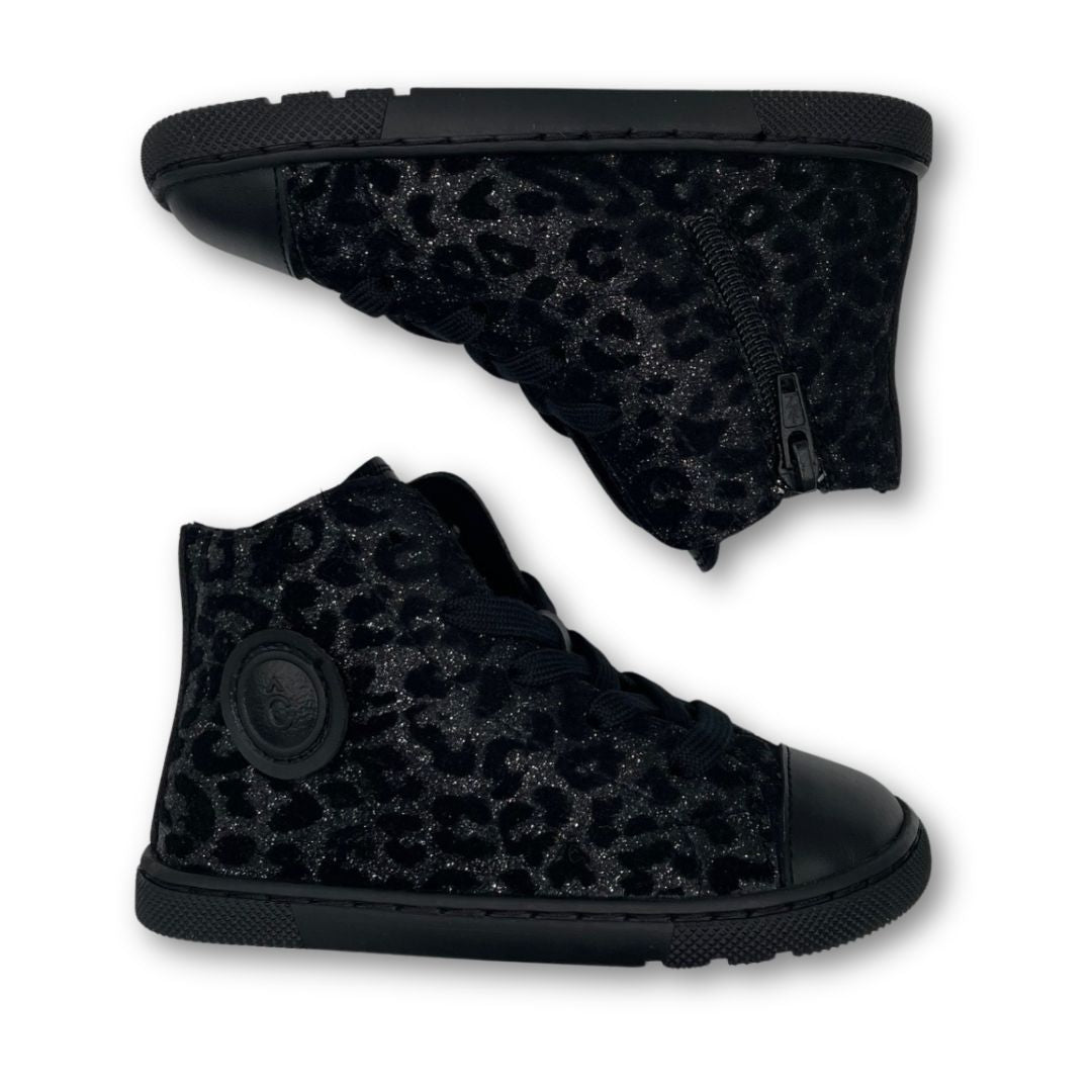Con su acabado de terciopelo negro con estampado leopardo brillante, combinan el estilo moderno con la comodidad de un calzado respetuoso.