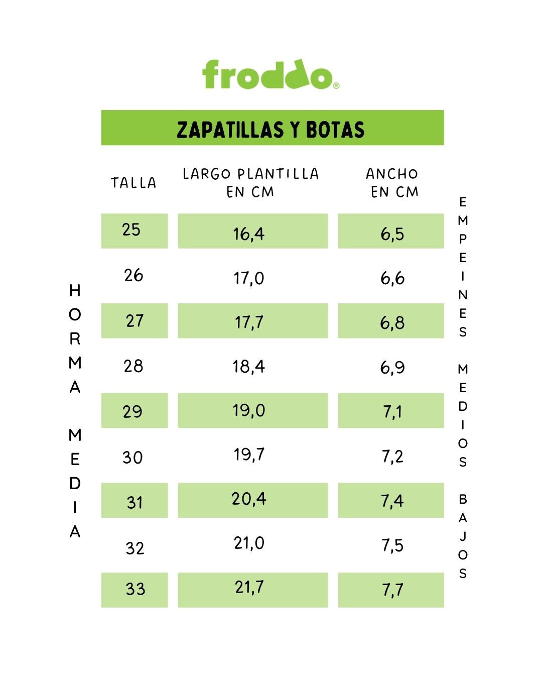 Las medidas reflejadas en la guía de tallas son de la plantilla. Dejar un espacio de 0,8-1,2 cm de largo y 0,3-0,5 cm de ancho