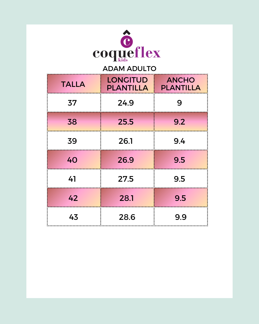 La tabla de tallas muestra la longitud y el ancho de la plantilla. Se recomienda sumar entre 0,8 mm y 1,2 cm a la longitud del pie.