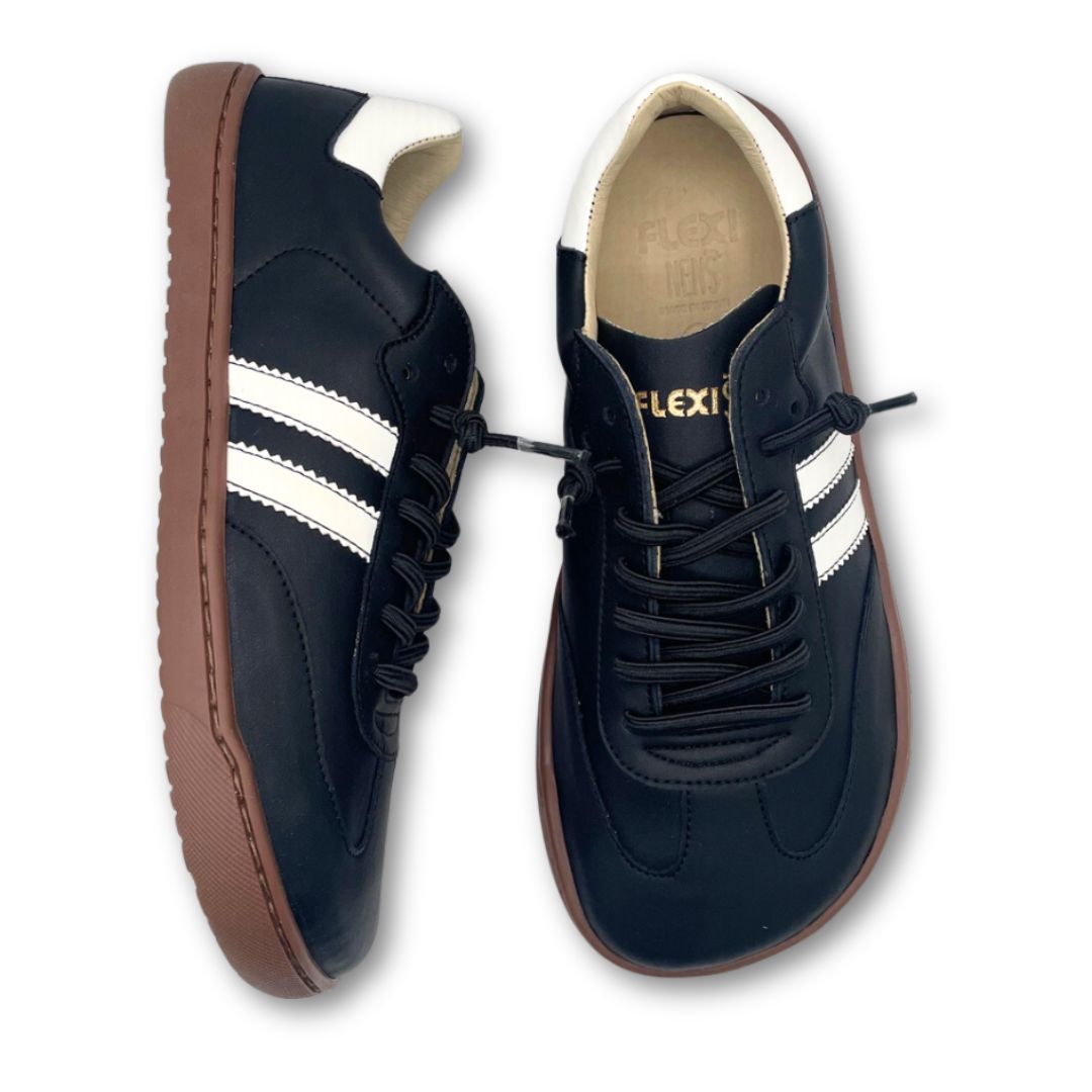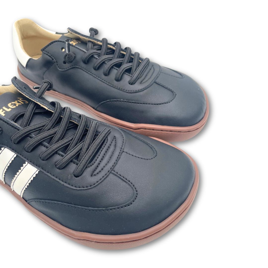 Zapatilla barefoot de FlexiNens en piel negra con detalles en blanco, diseñada para quienes buscan máxima comodidad y un ajuste amplio sin renunciar a un estilo deportivo y versátil. Su diseño limpio y atemporal la convierte en una opción ideal para el día a día.